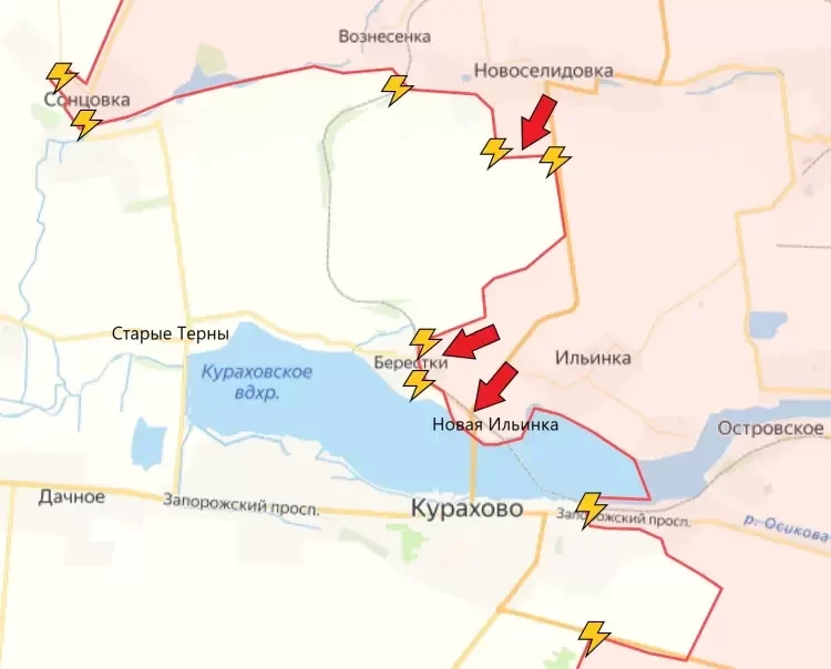 На Кураховском направлении иодтверждается зачистка от противника Вознесенки и Новоселидовки. От последней ВС РФ продвинулись чуть южнее. Более существенно продвижение зафиксировано западнее Ильинки. Под контроль Армии России перешёл населённый пункт Новая Ильинка, который также называют северным микрорайоном Курахово. Он вплотную прилегает к дамбе, через которую идёт дорога на Курахово. Также через Новую Ильинку проходит и железная дорога, которая также ведёт на южный берег Кураховского водохранилища, сообщает PulsePen. Идут бои в Берестках. Наши бойцы постепенно выдавливают противника и в скором времени возьмут под контроль населённый пункт.