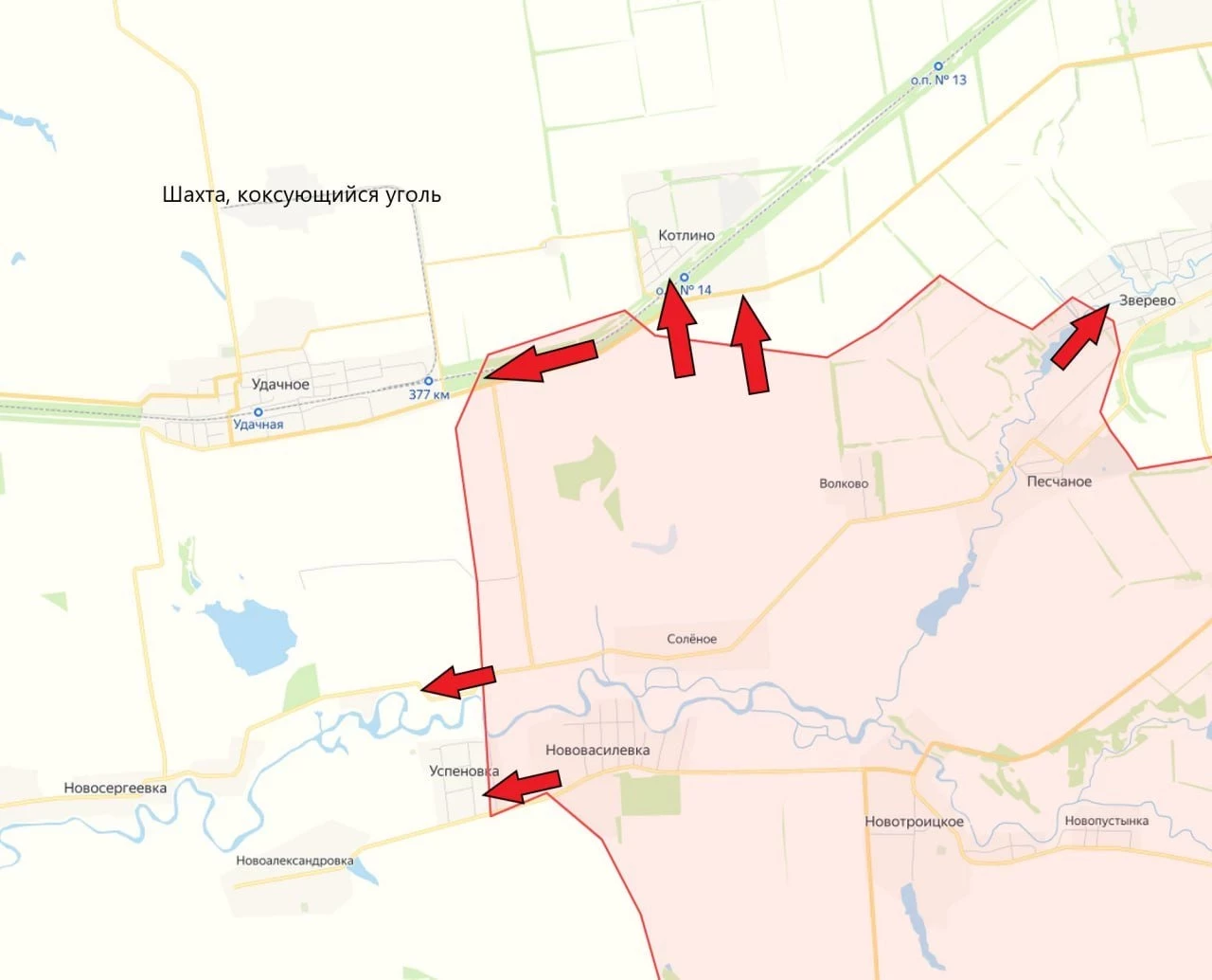 Штурмовые отряды Армии России зашли на южные окраины Котлино. Некоторые источники утверждают, что нашим бойцам удалось там закрепиться. Помимо этого, есть движение на запад - в направлении Удачного, севернее которого располагается месторождение коксующегося угля.