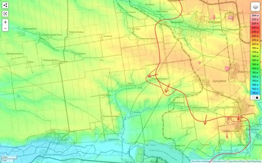 А вот на Кураховском направлении, удар идет в лоб. И последняя из них проходит южнее Шахтерского, севернее Новоукраинки (на высотах за селом), южнее Богоявленки.