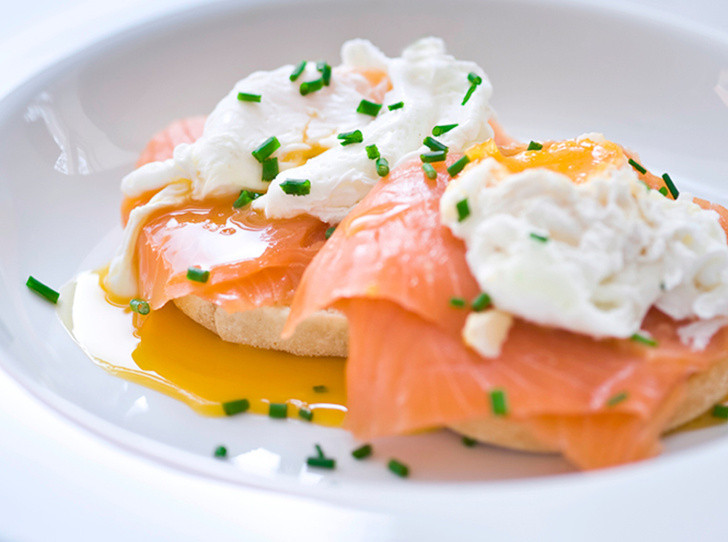 Отварите яйца в кипятке с уксусом и подавайте их с лососем на булочке, приправив солью и перцем.
